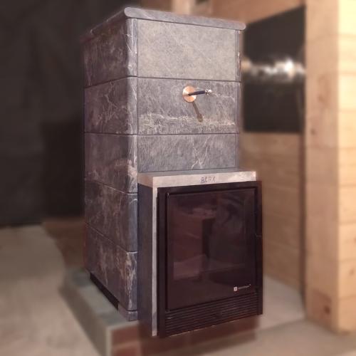 Банная печь ИзиСтим Сочи с боковым подключением в кожухе из талькохлорита под ключ (2021)