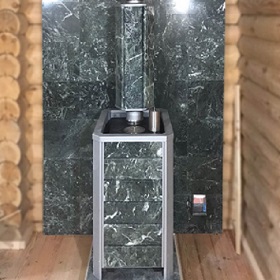 Банная печь ИзиСтим Ялта 25 в кожухе из природного камня (змеевик) под ключ (монтаж 12.2021)