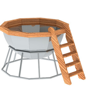 Борта изготовлены из долговечной древесины кедра, по кругу смонтирована деревянная скамья для сидения, лестница защищена от скольжения, а для удобства ног установлен подножник (деревянная решетка).