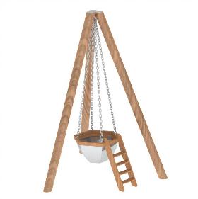 В комплект входят 3 больших, толстых бревна, к которым крепятся цепи. А к цепям, в свою очередь, крепится чан. Бревна покрыты специальным составом, защищающим от воздействия ультрафиолета и влаги.