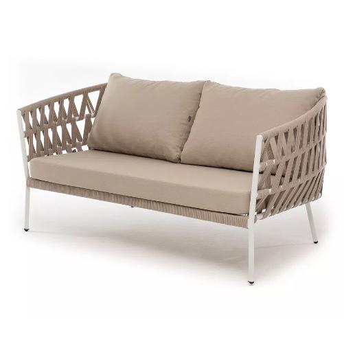 Диван 2-местный плетеный из роупа 4SiS Диего, каркас алюминий белый муар, роуп бежевый круглый, ткань бежевая 052