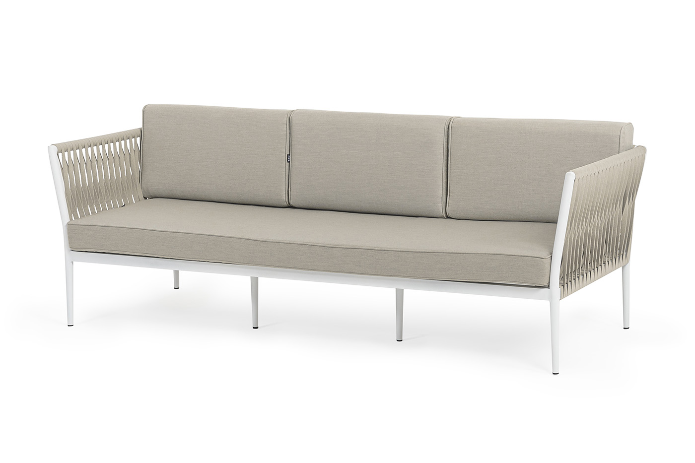 4SiS "Касабланка" диван 3-местный плетеный из роупа, каркас алюминий белый муар, роуп бежевый 20мм, ткань бежевая 15052