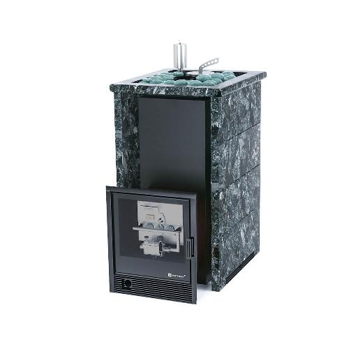 Банная печь ИзиСтим Сочи в трехстороннем кожухе Пироксенит с открытым верхом с газовой горелкой (САБК-40)