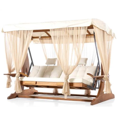 - Качели выполнены из ироко - это африканский дуб, порода дерева, отличающегося своей повышенной прочностью и долговечностью. Структура дерева отделана наилучшим способом, дарит приятные бархатистые ощущения от прикосновения. Древесина ироко богата маслами, что делает ее водоотталкивающей. Она устойчива к дождю, ветру, влаге, гниению, солнечному свету и холоду. Мебель из ироко допускает круглогодичную эксплуатацию на открытом воздухе, выдерживает перепады температур от –30°C до +30°C. Срок службы более 20 лет.