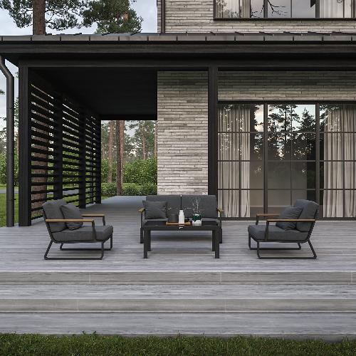 Особенности: подлокотники из благородного тика, уличная ткань (олефин), съемные чехлы подушек на "молнии", дополнительно можно приобрести комплект защитных чехлов