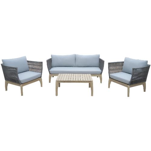 Иногда мелкие детали могут решить все! Сочетая в себе прочную выбеленную древесину твердых пород АКАЦИИ, холодно-серую двойную оплетку морского каната и водостойкие, легко чистящиеся мягкие подушки светло-серого оттенка, уличный комплект для отдыха River обеспечивает идеальный баланс между долговечностью и стилем.
