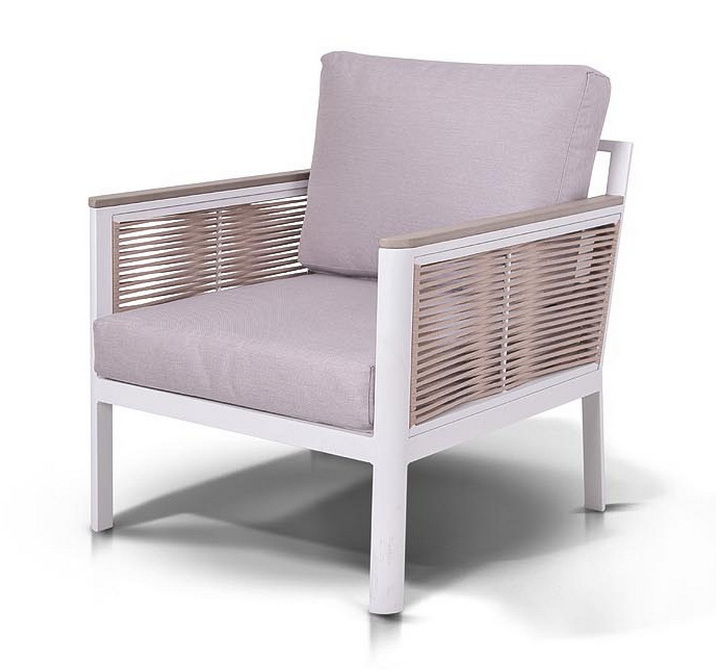 "Сан Ремо" кресло плетеное из роупа садовое, каркас алюминий белый, роуп бежевый, ткань бежевая