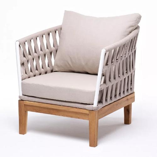 Кресло плетеное из роупа 4SiS Диего, основание дуб, каркас алюминий светло-серый (RAL7035) шагрень, роуп бежевый круглый, ткань бежевая 15052