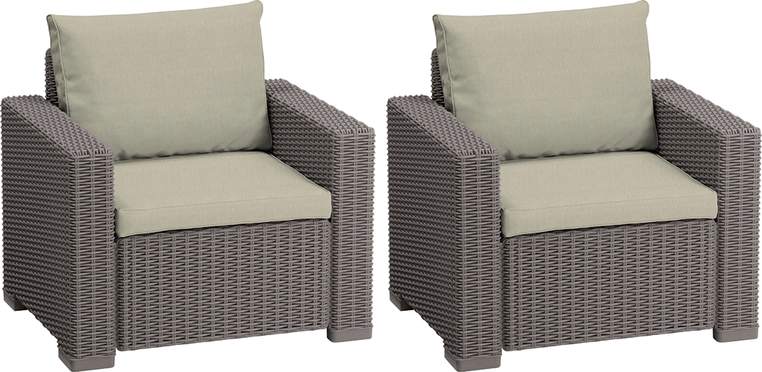 С ранних утренних часов до позднего ночного времени Вы можете отдыхать и расслабляться в комфортном кресле Калифорния. Стильная текстура, имитирующая ротанговое плетение, исключительно широкие подлокотники, подушки сиденья и спинки - благодаря им это кресло идеально подходит для того, чтобы отдыхать в летний день. А поскольку оно изготовлено из устойчивого к погодным условиям пластика с защитой от ультрафиолетового излучения, Вы будете им наслаждаться на протяжении многих сезонов, не заботясь об уходе.