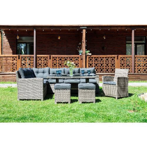 Также набор дополнен двумя пуфами и мягкими подушками-сидениями, чехлы для которых изготовлены из водоотталкивающей ткани. Дачная мебель Genry на долгие годы Комплект мебели Genry изготовлен на основе каркаса из легкого, но в то же время прочного алюминиевого каркаса, способного выдерживать весовые нагрузки до 200 килограмм без риска деформации или расшатывания предметов. Что касается декоративной отделки, то она выполнена посредством плотного плетения нитей из искусственного ротанга. Данный синтетический материал отлично противостоит контактам с водой, поэтому накрывать мебель чехлами во время дождя вовсе не нужно. Кроме того, техноротанг не выгорает на солнце и не теряет своих качеств при частых и резких сменах температурного режима. Чехол на комплект GENRY Ширина подлокотника - 9 см