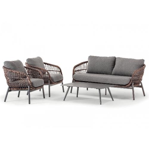 Уличный комплект Elba состоит из двухместного дивана, двух кресел и журнального столика со столешницей из алюминий. Алюминиевый каркас оплетен синтетическим роупом, мягкие подушки на сиденьях и спинках со съемными чехлами из олефина, устойчивого к загрязнениям и ультрафиолетовому излучению.