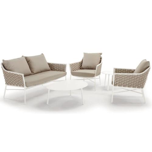 Комплект Panama состоит из двухместного дивана, двух кресел и журнального столика. Устойчивый и надежный каркас из алюминия кресел и дивана оплетен текстиленовым и резиновым канатом. Подушки из текстилена обеспечивают дополнительный комфорт. Журнальный столик выполнен из алюминия. Стильный и удобный комплект можно разместить в зоне отдыха в помещении или на открытом воздухе.