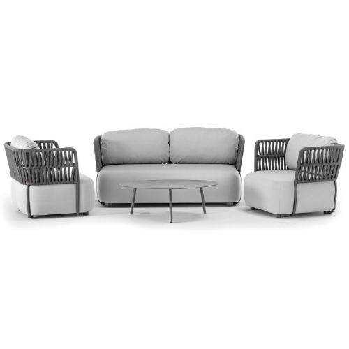 Комплект Soft выполнен из алюминия, оплетенного полиолефиновым роупом, и состоит из двухместного дивана, 2-х кресел и журнального столика. Съемные чехлы мягких комфортных подушек выполнены из устойчивого к пятнам и ультрафиолетовому излучению акрила.