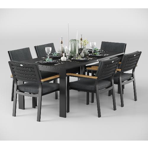 Особенности: каркас мебели выполнен из всесезонного алюминия с порошковым покрытием темно-серого цвета (карбон), подушки спинок и сидений стульев обшиты уличной тканью (олефин) темно-серого цвета, толщина подушек 5 см, чехол съемный на "молнии", столешница обеденного стола изготовлена из алюминиевых планок шириной 7 см