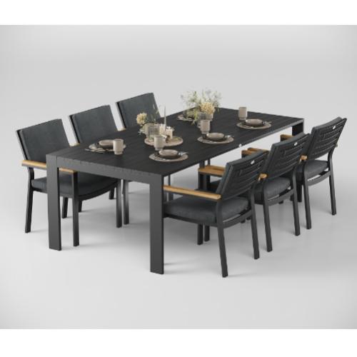 Особенности: каркас мебели выполнен из всесезонного алюминия с порошковым покрытием темно-серого цвета (карбон), подушки спинок и сидений стульев обшиты уличной тканью (олефин) темно-серого цвета, толщина подушек 5 см, чехол съемный на "молнии", столешница обеденного стола изготовлена из алюминиевых планок шириной 7 см