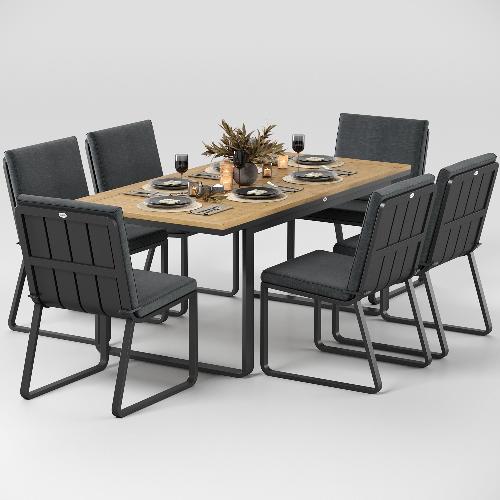 Особенности: каркас мебели выполнен из всесезонного алюминия с порошковым покрытием темно - серого цвета (карбон), подушки сидений и спинки обшиты уличной тканью (олефин) темно - серого цвета, толщина подушек 5 см, чехол съемный на "молнии", столешница обеденного стола изготовлена из тиковых планок