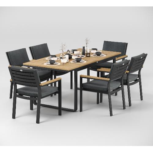Особенности: каркас мебели выполнен из всесезонного алюминия с порошковым покрытием темно - серого цвета (карбон), подлокотники стульев декорированы вставками из тика, подушки сидений и спинки обшиты уличной тканью (олефин) темно - серого цвета, толщина подушек 5 см, чехол съемный на "молнии", столешница обеденного стола изготовлена из тиковых планок