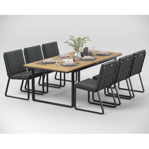 Особенности: каркас мебели выполнен из всесезонного алюминия с порошковым покрытием темно - серого цвета (карбон), подушки сидений и спинки обшиты уличной тканью (олефин) темно - серого цвета, толщина подушек 5 см, чехол съемный на "молнии", столешница обеденного стола изготовлена из тиковых планок