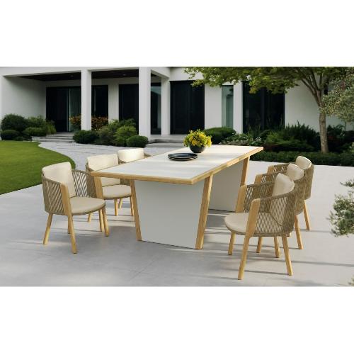 Обеденные столы имеют керамическую столешницу толщиной 6мм с краями из цельного тика, вес стола- 67,5кг. Алюминиевый каркас спинки сиденья кресла, ножки из тикового дерева FSC + олефиновая веревка, подушка с наполнителем из пенополиуретана, солнцезащитная ткань.