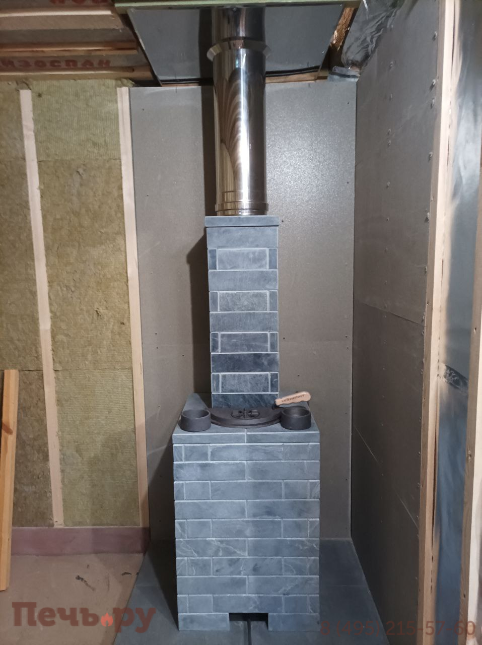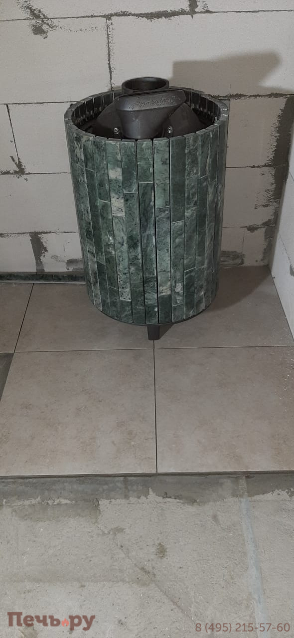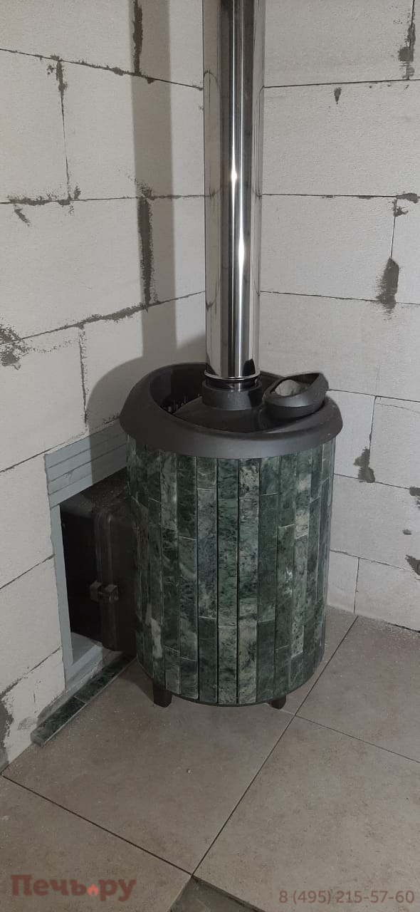 Облицовка из ламелей змеевик, материал корпуса - чугун ЧХ-1. Колосник, зольник, паровая пушка, выносной туннель, режимы - русская баня, сауна, хамам.