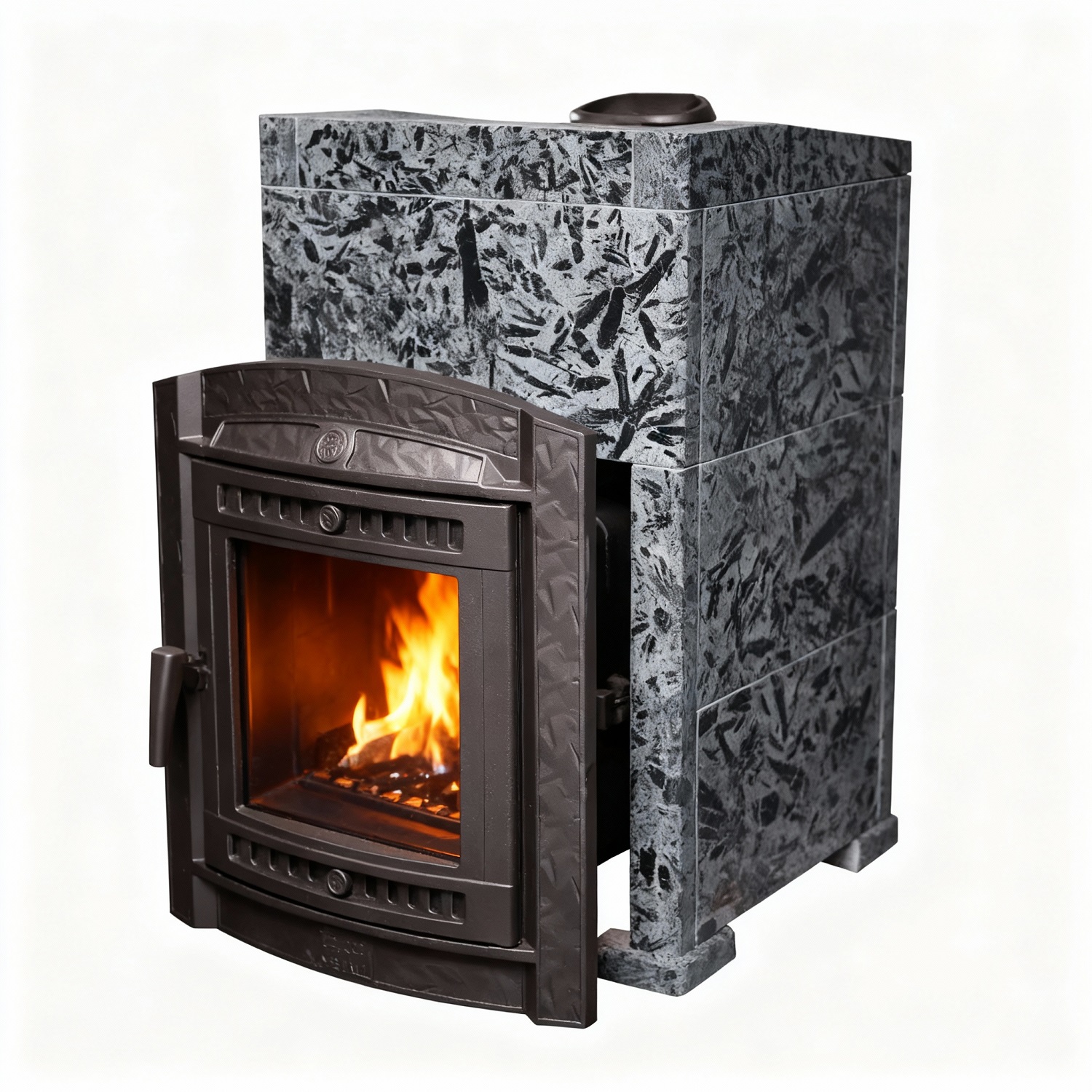 • Закрытая каменка, расположенная внутри топки позволяет провести нагрев камней до очень высоких температур. Камни находятся внутри корпуса каменки и нагреваются непосредственно пламенем равномерно со всех сторон.