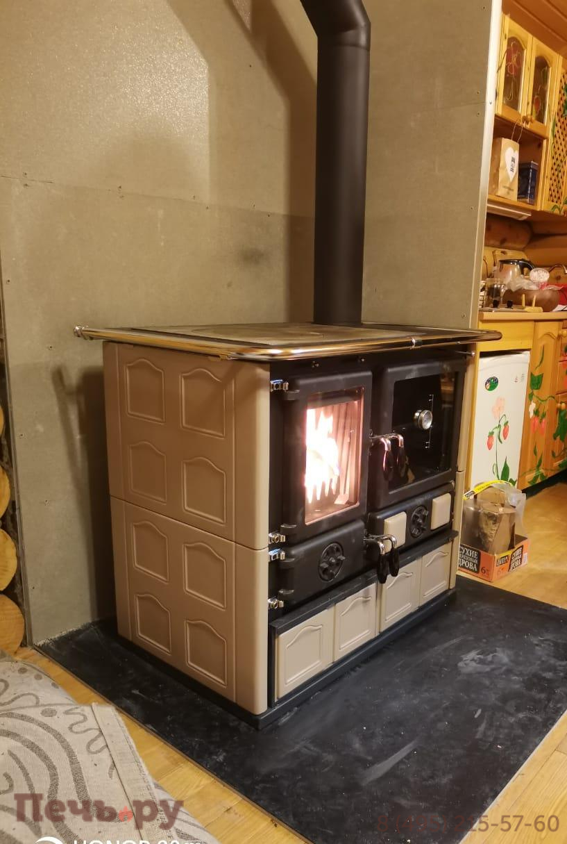 Печь из чугуна, облицовка керамикой, большая варочная поверхность, система вторичного дожига.