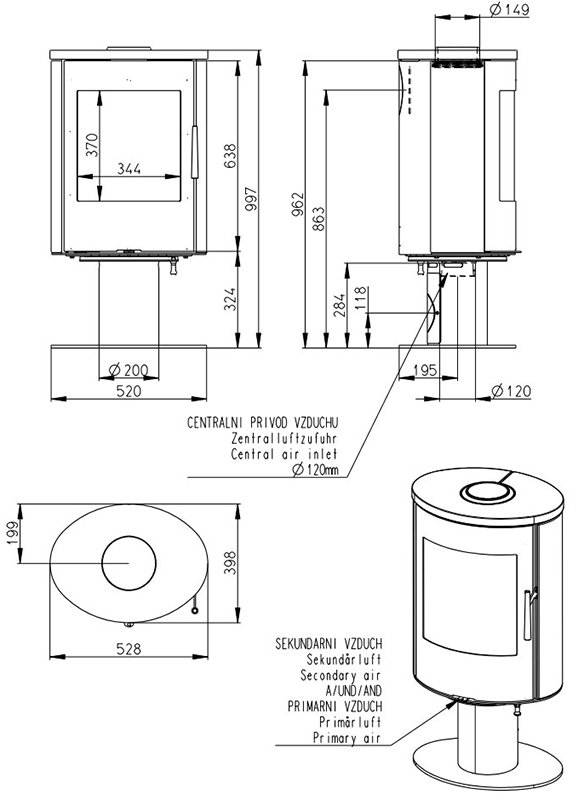 высота: 997 мм, ширина: 528 мм, глубина: 398 мм.