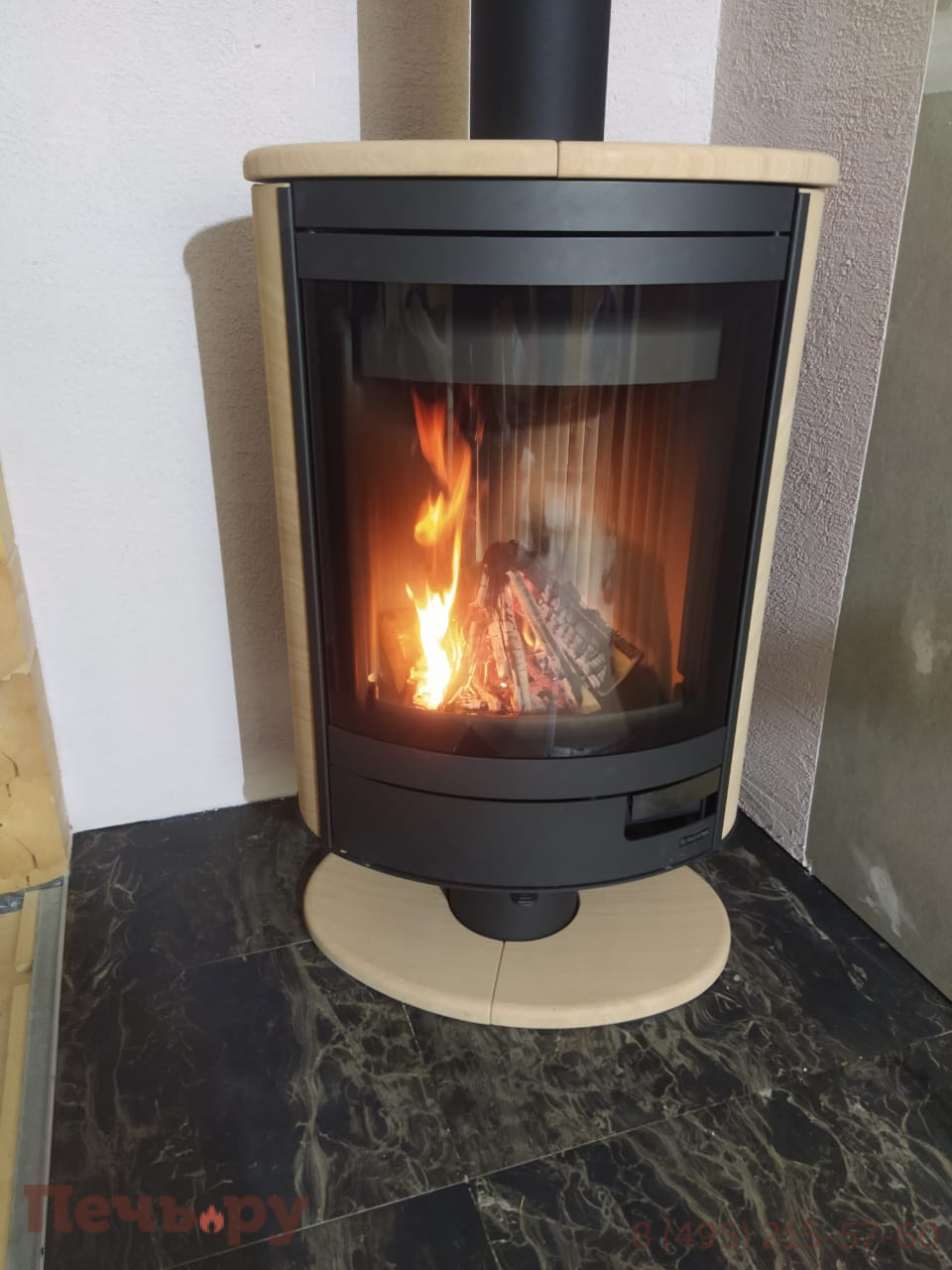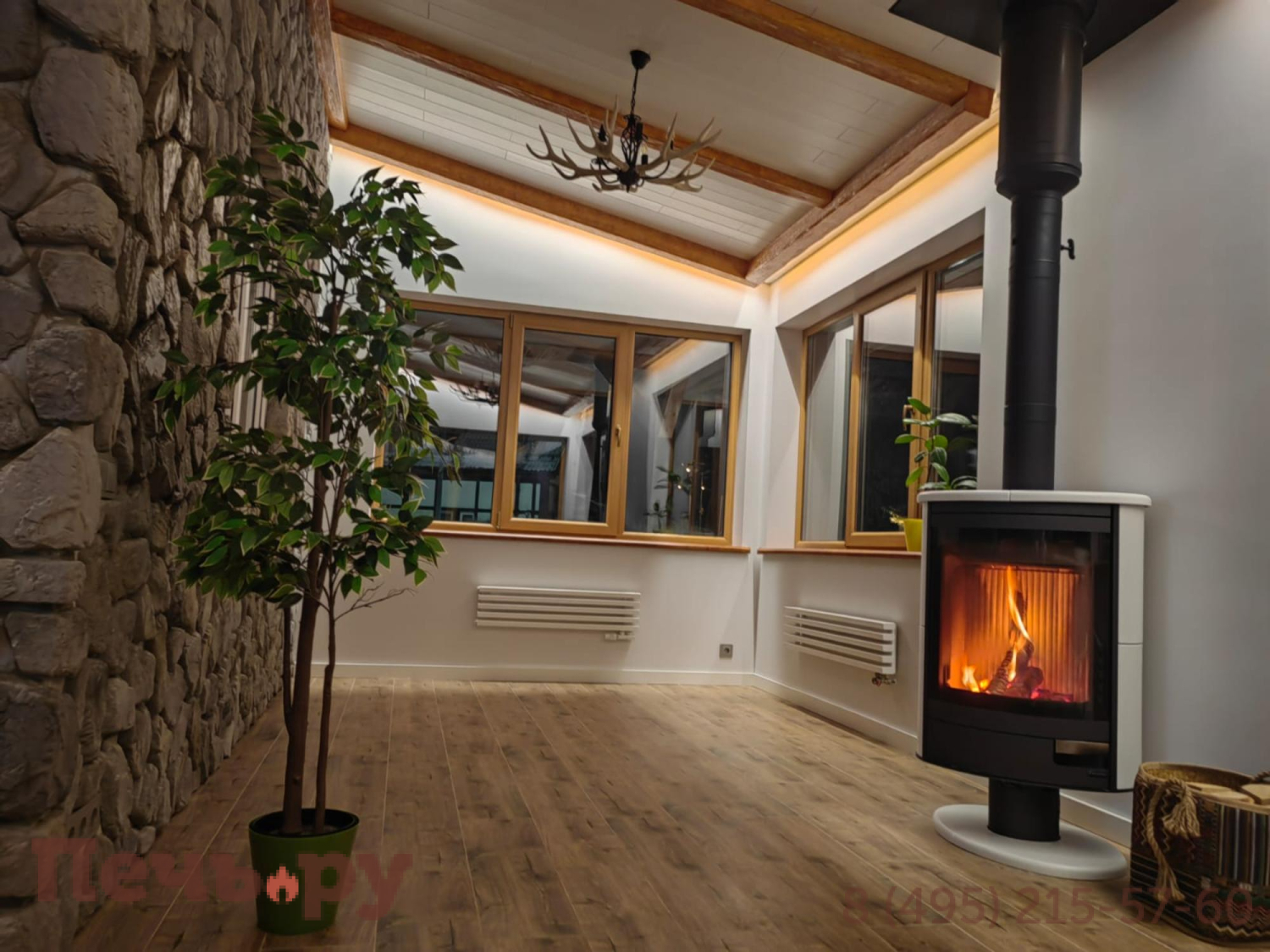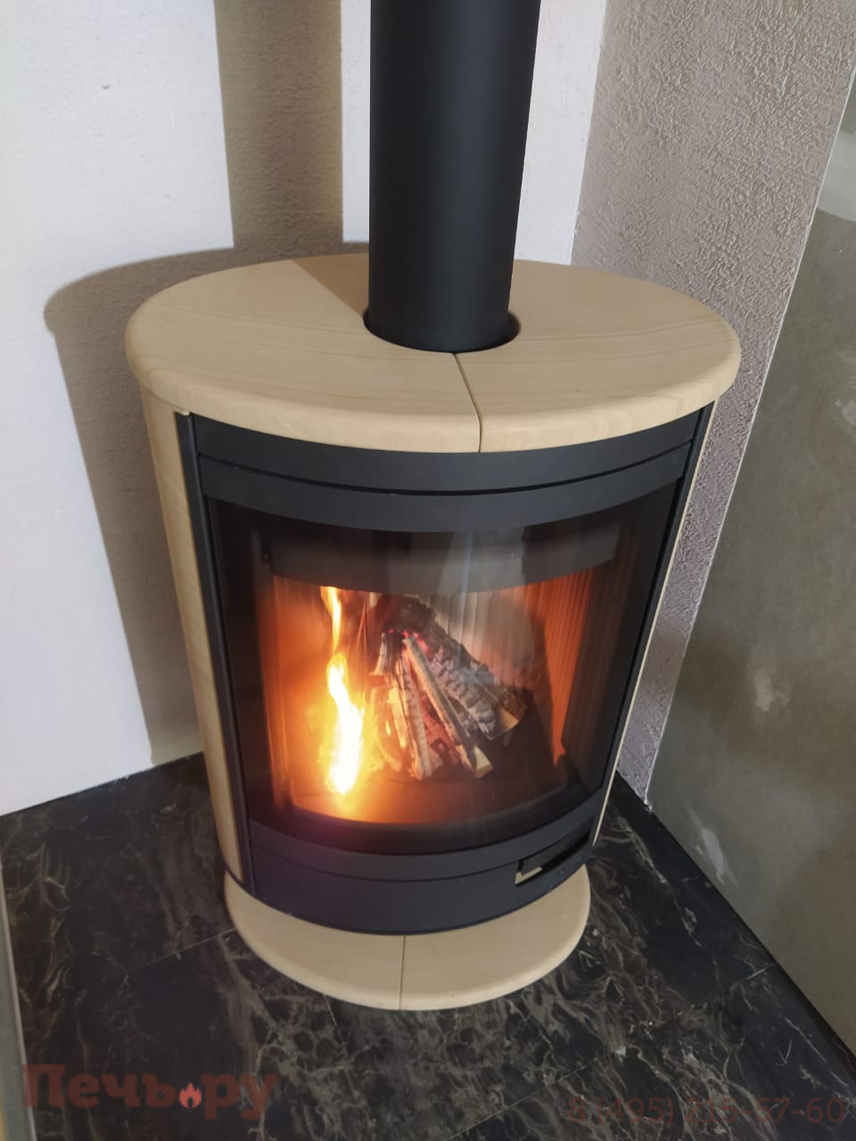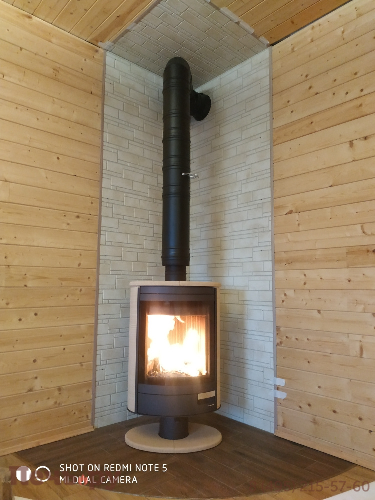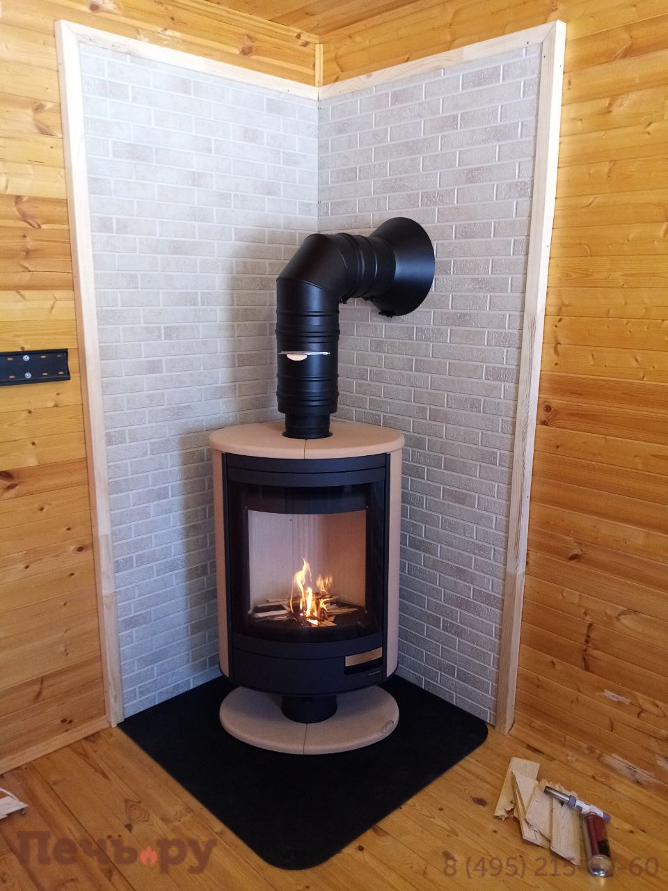 Топка вращается вокруг дымохода, поэтому он подключается только сверху. Диаметр дымохода распространённый – 150 мм. Печь-камин N спроектирована как пристенная, но при желании вы можете поместить её в центр комнаты и смотреть на огонь с разных точек пространства. Вертите топку, как нужно: фасадом то к столу с гостями, то к дивану или креслу, то к входу в помещение. И всякий раз огонь будет восприниматься по-новому. Возможность поворачивать камин придётся очень по вкусу любителям перестановок.