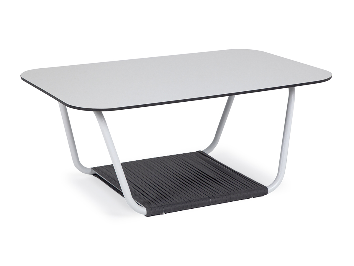 "Гранада" журнальный стол 90х60см из HPL, цвет "молочный", каркас белый муар, роуп темно-серый круглый