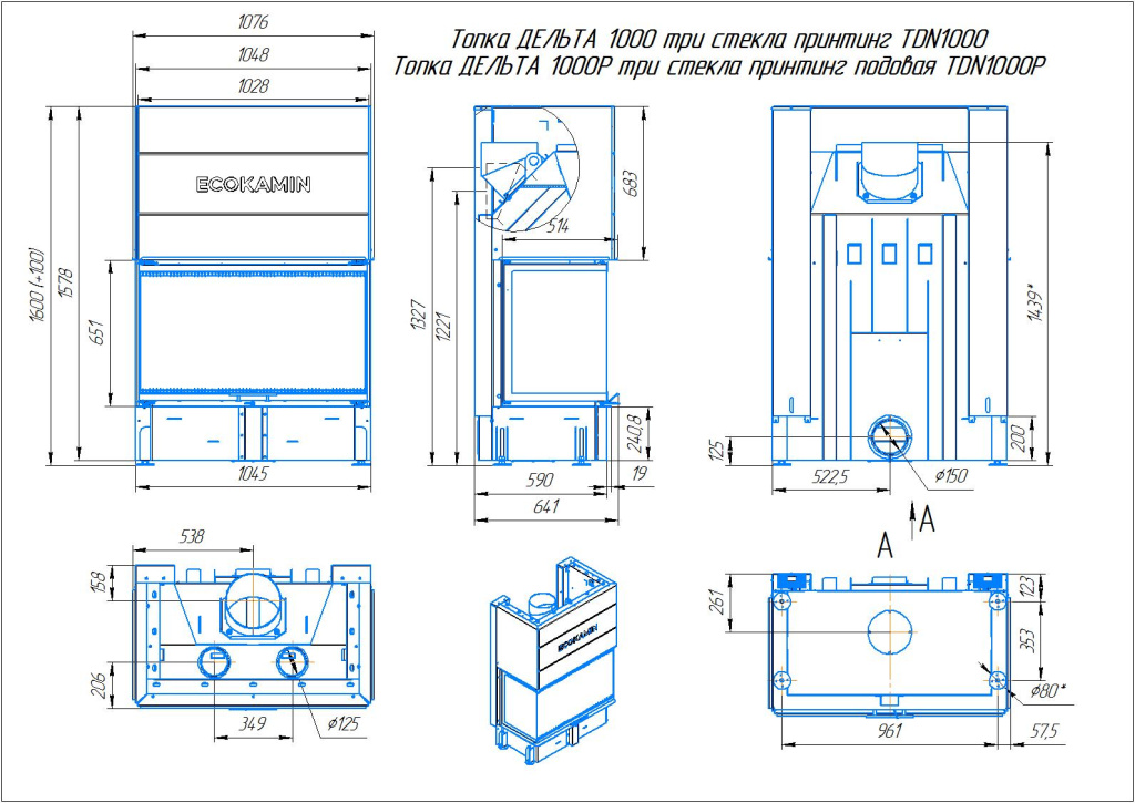 Инструкции, чертежи, документы - Каминная топка ЭкоКамин Дельта 1000 Р три стекла подовое горение принтинг