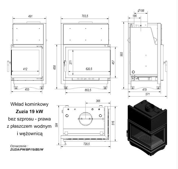 Инструкции, чертежи, документы - Каминная топка Kratki Zuzia/PW/BP/19/BS/W (угловое стекло справа, змеевик)